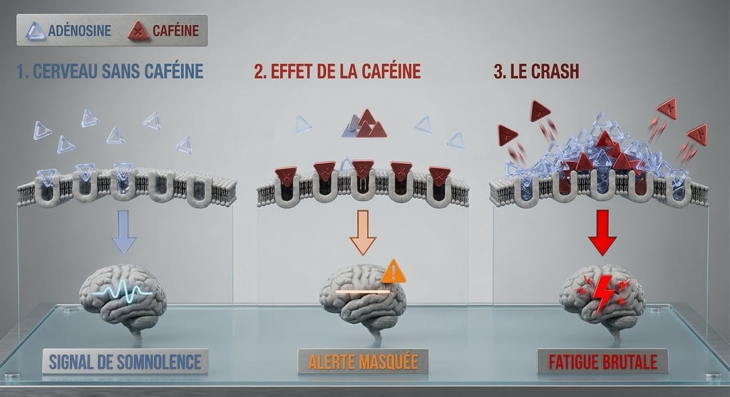La caféine ne vous donne pas d'énergie réelle. Elle se contente de masquer temporairement le signal de fatigue (l'adénosine) envoyé à votre cerveau, préparant le terrain pour un effondrement brutal.