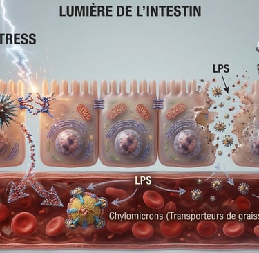 L'endotoxémie métabolique se produit lorsque les fragments bactériens (LPS) forcent le passage intestinal par deux voies distinctes : en piratant les transporteurs de graisses ou en profitant des brèches créées par le stress et les additifs.
